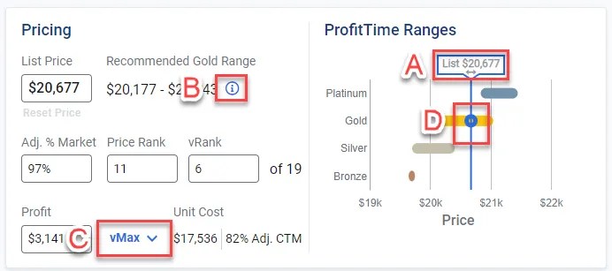 A price range higher than the market average means a vehicle has a strong profit potential and is worth holding onto to get a little extra margin. A lower price range reflects a unit with low profit potential — one that should be priced to sell quickly.