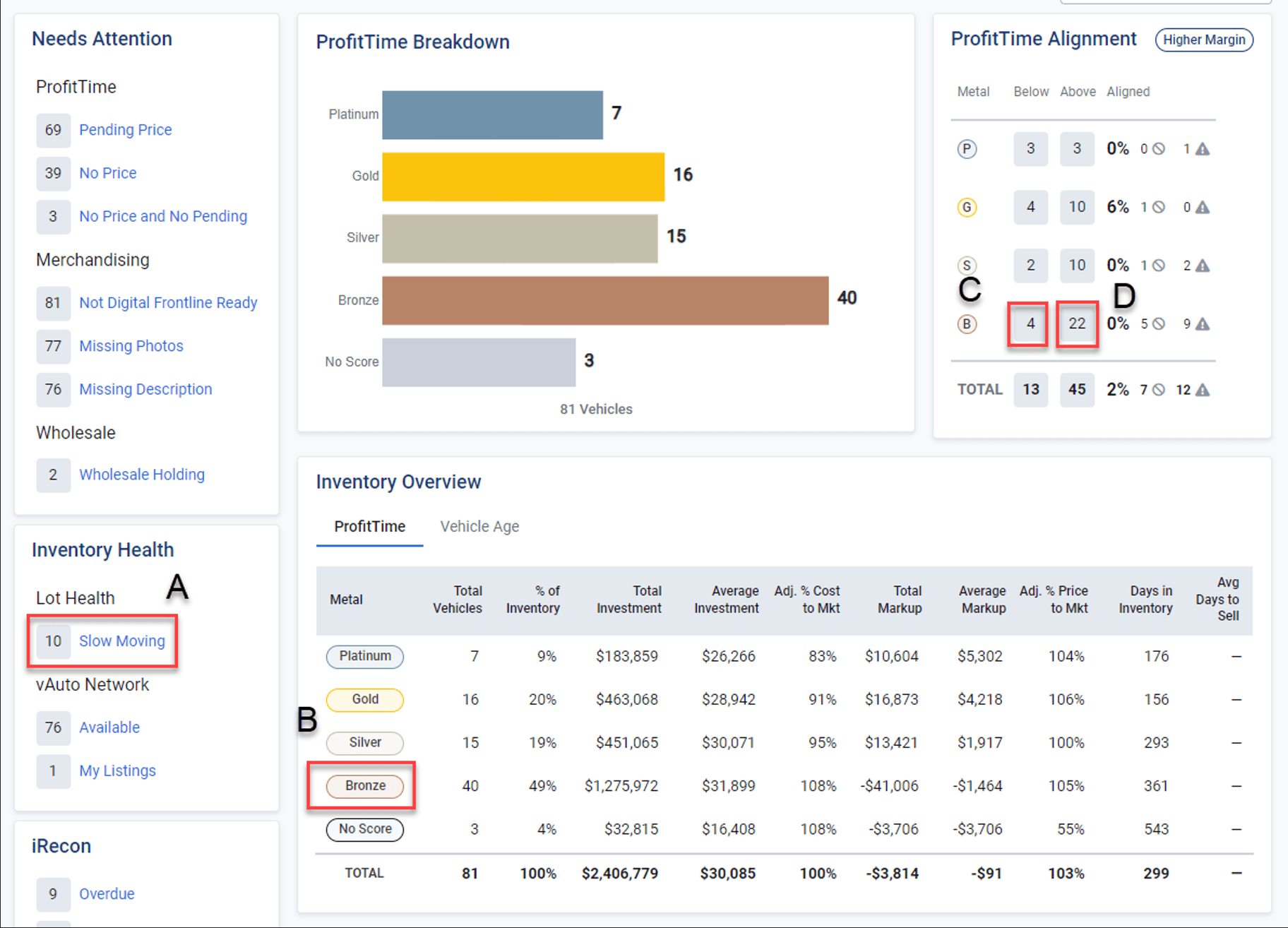 And if we look at our Pricing Alignment Box, we see the dealership has priced 14 of those Bronze vehicle investments above ProfitTime’s recommendation — an amount we’d probably say is too high. We’d strongly recommend lowering the asking price on a few of these units.