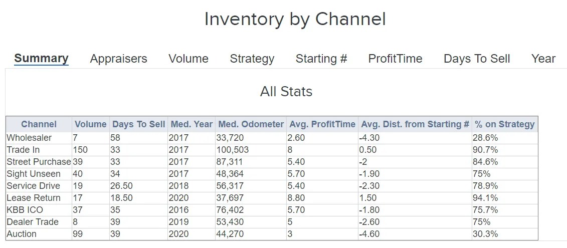 You’ll see the number of vehicles you’re getting from each channel, average days to sell, median year, median odometer, average ProfitTime score, average distance from your target score, and what percent of vehicles were acquired within your dealership’s strategy.